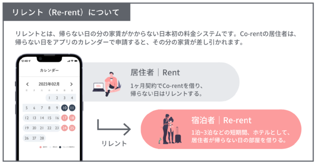 本物件は、帰らなかった日数に応じて家賃が減額される新しい家賃システム「リレント」を採用しています。入居者が、帰らない日の部屋をさらにホテルとして短期宿泊客に貸し出す(Re-Rent)ことで、家を使ってない日の家賃を節約することができます。