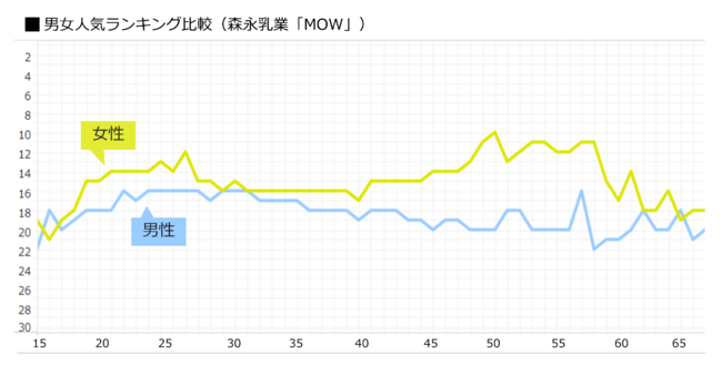 森永乳業「MOW」は男性19位、女性14位と、特に女性人気が高い結果となりました。CMに女性人気の高い山崎育三郎さんを起用し、「プレミアム」「素材へのこだわり」を押し出しているのも女性人気に関係しているかもしれません。