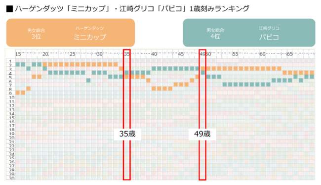 1回目は35歳で、20歳から33歳まで2位をキープしているハーゲンダッツ「ミニカップ」が、江崎グリコ「パピコ」と順位が入れ替わります。