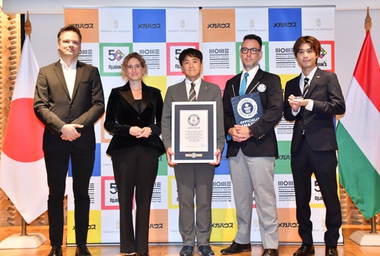(左から) 『Rubik 80/50 Fifty Years of Magic ルービック80/50 マジックの50年』アカデミーダイレクター プシュプク・バラージュ氏、駐日ハンガリー国特命全権大使 オルネル=バーリン・アンナ閣下、株式会社メガハウス 代表取締役社長 佐藤 明宏、ギネス世界記録公式認定員 ジャスティン・パターソン氏、株式会社メガハウス トイ事業部 商品担当 武智 亮