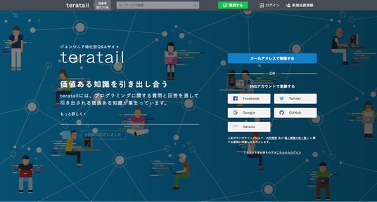 「teratail(テラテイル)」は、2014年7月にオープンしたエンジニアの問題解決プラットフォームです。プログラミング時に抱える問題や課題を質問すると、全国のユーザーが自身の知見を活かして回答します。オープンからわずか4年半で月間500万PVを突破し、国内最大級のエンジニア向けQ&Aプラットフォームへ成長。1ヶ月に2万件を超える投稿(質問、回答、コメントの合計)があり、回答率は90%超えを実現。言語ユーザー界の代表や有名な技術本の著者など技術発展に貢献されているエキスパートも多数参画しており、学生やプログラミング初心者から第一線で活躍する方々まで、幅広いエンジニアの問題解決をサポートしています。