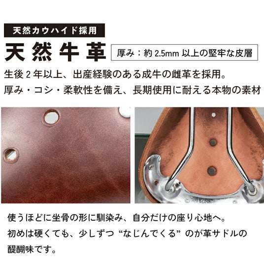 このレザーサドルには、合成皮革ではなく、天然カウハイドを使用しています。
