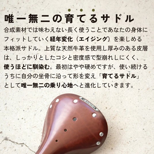 合皮のように剥がれず、使うほどに味が出て愛着も増す“育てるサドル”です。