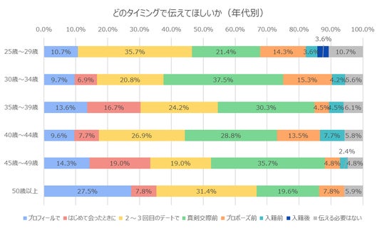 年代別に見ると、どの世代においても「2~3回目のデート」や「真剣交際前」を希望する人が50%以上を占め、ある程度関係性が築かれた段階で正直に話してほしいという考えが共通しているようです。