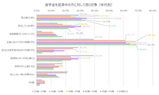 25歳~29歳では「経済的に少し不安に感じる(39.3%)」が「正直に伝えてくれたら信頼できる」と同率で、「努力家だと思う(28.6%)」「自分にも奨学金があるので共感できる(28.6%)」が続いています。