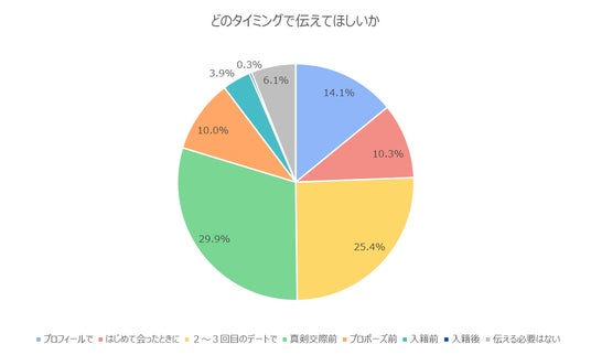 最も多かったのは「真剣交際前(29.9%)」、次いで「2~3回目のデートで(25.4%)」という結果となりました。