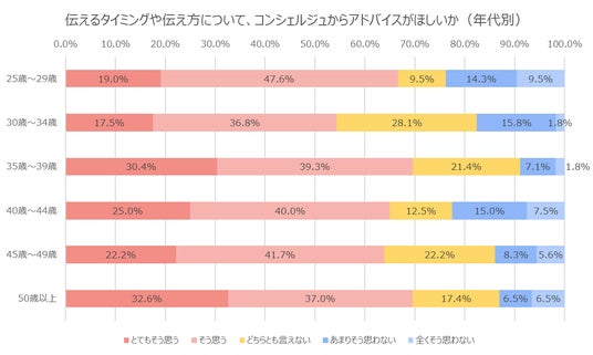 もっともアドバイスを求めているのは35歳~39歳の方で、69.7%となり、伝える内容やタイミングについて慎重に考えたいという意識が特に強いことがわかりました。