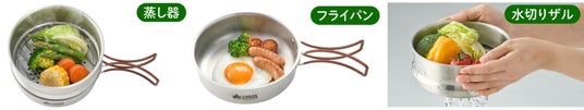 本アイテムは、蒸し器、フライパン(浅鍋)、水切りザルの1台3役をこなすことができる、アウトドアに最適なコンパクト構造のクッカーセットです。