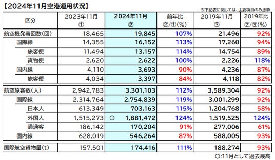 ⚫ 国際線旅客数は275万人(19年同月比92%)となり、そのうち外国人旅客数は紅葉を目 的とした訪日需要が堅調で、188万人(19年同月比124%)となりました。11月として過 去最高であり、今年2月以降10カ月連続で当該月の最高値を更新しています。国際線日 本人旅客数も19年同月比で6割近くまで回復しました。