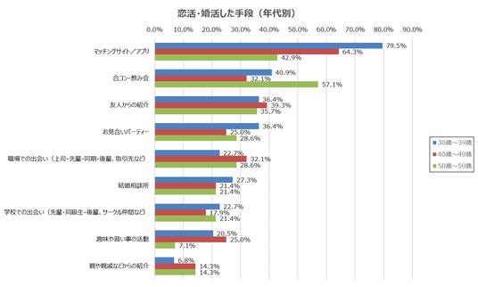 先ほどのデータを年代別に集計したところ、「マッチングサイト/アプリ」「お見合いパーティー」「結婚相談所」といった恋活・婚活手段を利用する割合は30代が最も高い結果となりました。恋活・婚活サービスが充実し、自分から行動を起こして恋活・婚活する時代になってきたと言えるのではないでしょうか。