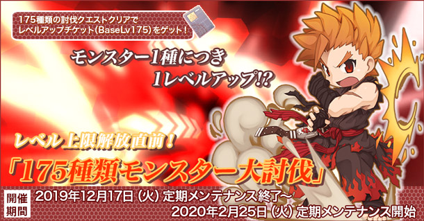 2020年1月28日(火)に来るレベル上限解放アップデートの前に、現在のレベル上限であるBaseLv175まで成長できるイベント「175種類モンスター大討伐」を開催いたします!