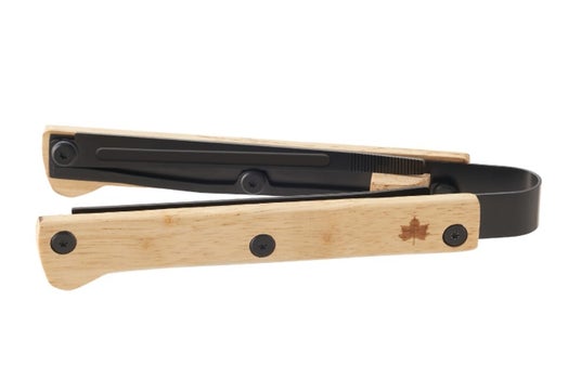 持ち手部分は天然素材ならではのあたたかみが感じられる木製素材でメイプルリーフのロゴの焼印入り。折りたたみ式でコンパクトになるため、別売りのメスキットの中に収納して持ち運ぶことができる。