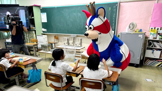 提供日に合わせて、ゴーディーが沖縄市立コザ小学校を訪問し、1年生の子どもたちと給食時間に交流しました。