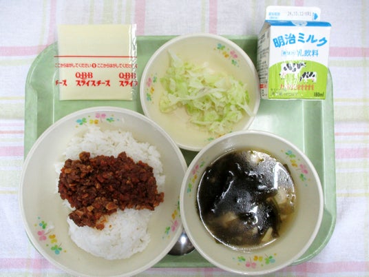 タコスミート、タコスサラダ、スライスチーズ、ワカメスープ、ごはん、牛乳