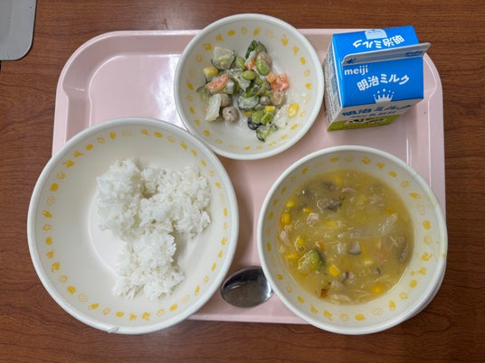 黄金芋のクリームシチュー、コロコロサラダ、ごはん、牛乳