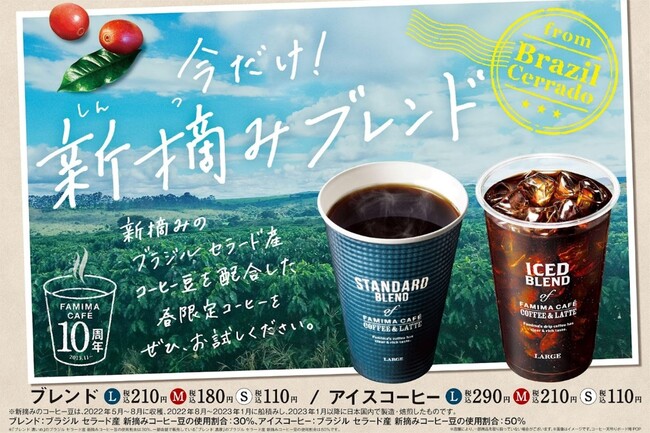 FAMIMA CAFÉの「新摘みブレンド」は、2022年5月~8月に収穫、2022年8月~2023年1月に船積みし、2023年1月以降に日本国内で製造・焙煎されたブラジル セラード産の最高等級豆を、ブレンドに30%、アイスコーヒー・カフェラテ・アイスカフェラテに50%使用しております。ぜひこの機会に、こだわりの一杯をお楽しみください。