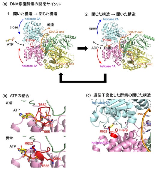図1:DNA修復酵素の開閉サイクルと遺伝子変化の影響。ATPが結合部位(P-loop)に結合すると閉じた構造でエネルギーを使い、使い終えた分子(ADP + リン酸)を手放すと開いた構造に戻る(a)。今回の遺伝子変化によるアミノ酸置換(T652→R652)では、 ATPをつかまえる“指”(K654, T655)がずれ(b)、本来はくっつかない部分の思わぬ“結びつき”(R652とD973;破線)が生じてふたが閉じたまま戻りにくい状態になる(c)。