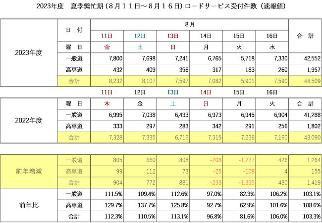 JAF(一般社団法人日本自動車連盟 会長 坂口正芳)は、お盆期間(2023年8月11日~8月16日まで)のロードサービス受付件数(速報値)をまとめました。