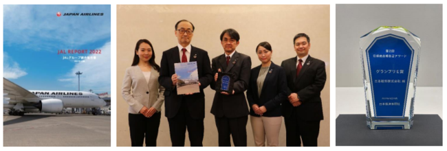 アワードでは、JALが2022年8月に発行した統合報告書「JAL REPORT 2022」(URL: https://www.jal.com/ja/sustainability/report/)について、さまざまな観点で審査(*2)され、その結果、「環境改善のプロセス記述が充実」「パーパスや理念がJALらしい。中期計画に沿った価値創造プロセスが秀逸であり、ESGとの関係づけを定量的な時系列目標とともに上手に表現している。」「環境改善のための具体的プロセスが充実し、2050年のネットゼロに向けたロードマップからも熱意を感じる」との講評をいただきました。