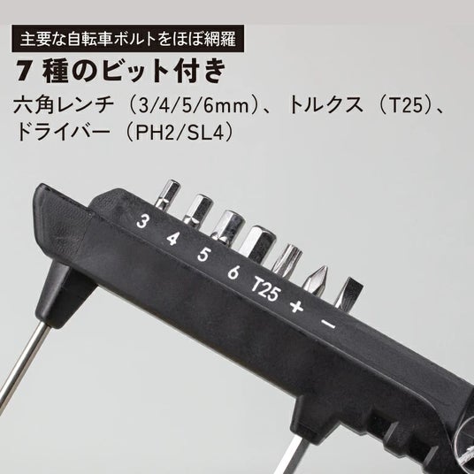 六角レンチ(アーレンキー):3mm / 4mm / 5mm / 6mm、トルクスビット:T25、プラスドライバー:PH2、マイナスドライバー:SL4