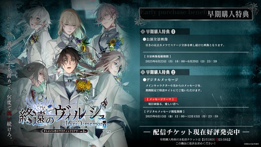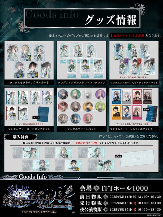 アイディアファクトリー株式会社(代表取締役社長:佐藤 嘉晃/所在地:東京都豊島区)の女性向けゲームブランド「オトメイト」は、2025年6月15日(日)に開催するオトメイトドラマティックシアターvol.03re「終遠のヴィルシュ -LyriC:memory-」のイベント物販商品ラインナップを公開いたしました。