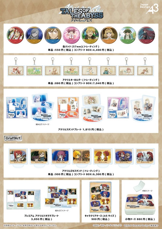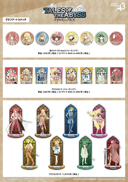 スケッチ風の伸びやかな線が特徴のグラフアートスケッチには、ルーク、ティア、ジェイド、アニス、ガイ、ナタリア、イオン、アッシュが登場。アニメ場面写を使用したグッズには、エンディングイラストからミュウや六神将の姿も。アニメの名シーンをGraffArtで描き起こした魅力的なグッズも要チェックです。
