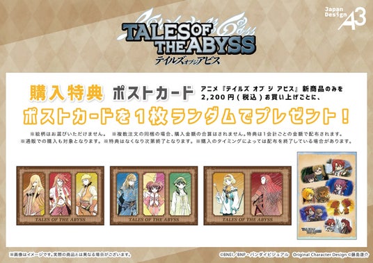 アニメ『テイルズ オブ ジ アビス』新商品のみを1会計2,200円(税込)お買い上げごとに、購入特典としてポストカード(全4種)をランダムで1枚プレゼント。友達に贈ってもよし、自宅に飾ってもよしの限定ポストカードをぜひゲットしてみてください!