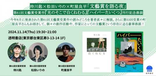第61回文藝賞を『ハイパーたいくつ』で同時受賞した松田いりのさんと2016年に同賞を受賞しデビューした芥川賞作家・町屋良平さん、そして『光のそこで白くねむる』の著者・待川匙さんによるプレミアムなトークイベント「文藝賞を語る夜」が開催決定。