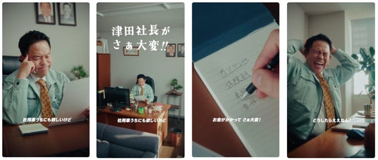 今回のWeb CMでは、津田さんが中小企業「津田商事」の3代目社長役を、阿部詩が津田商事の敏腕社員役を演じています。