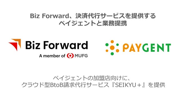 株式会社Biz Forwardは、決済代行サービスを提供する株式会社ペイジェントと業務提携を行いました。本提携によりペイジェントの加盟店向けに、クラウド型BtoB請求代行サービス『SEIKYU+』の提供が可能になります。