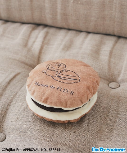 ふわふわの生地を表現したどら焼き形ポーチは、ビッグライトで大きくしたどら焼きにしがみつく「ドラえもん」のコミカルなイラストをプリントしました。