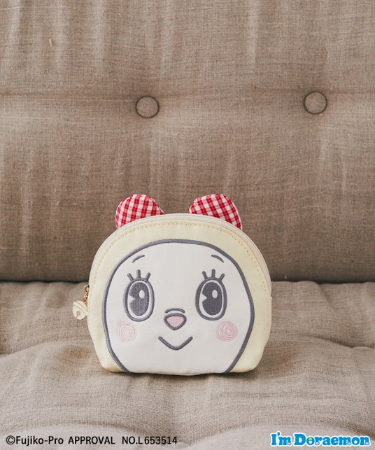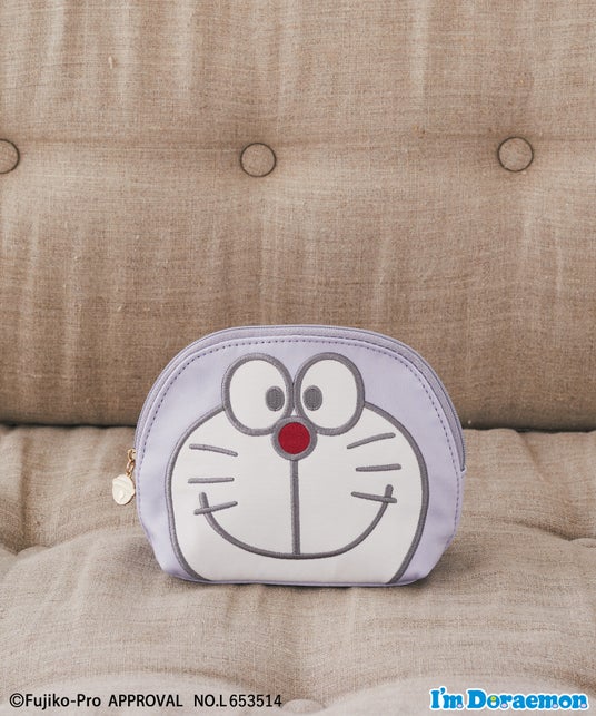 存在感のあるフェイス形ポーチは、淡い色使いで優しい雰囲気に仕上げ、背面にブランドロゴとアイムドラえもんのロゴを箔プリント、引手部分に鈴のチャームを付けたキュートなアイテムです。