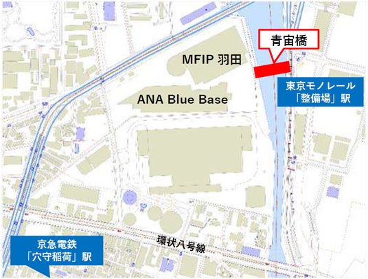 本計画地では、2017年よりANAホールディングスと三井不動産が大田区と連携し、羽田エリアの産業活性化に寄与する街づくり型開発プロジェクト「HANEDAインダストリアルパーク」を推進し、これまでにANAホールディングスのトレーニングセンター「ANA Blue Base」、三井不動産の物流機能を含む複合用途施設「三井不動産インダストリアルパーク羽田(以下、「MFIP羽田」)」の開発・運用を手掛けてまいりました。この度、「青宙橋」の開通により、開発開始から8年にわたる本計画は総仕上げを迎えました。