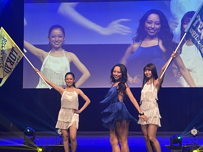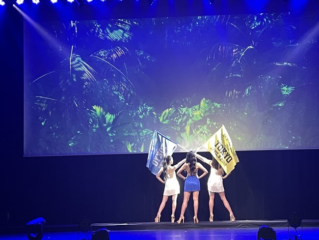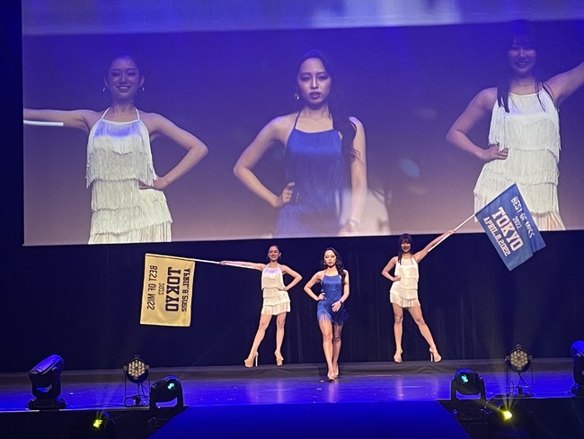 ベストオブミス東京2022 ウクライナをイメージした平和の願いを掲げたオープニングでイベントをスタートした。昨年2021年度の東京代表3名(岡林美空,西森由美子,箱崎唯華)によりウクライナをイメージした青色と黄色の旗を掲げてのランウェイウォーキングを披露
