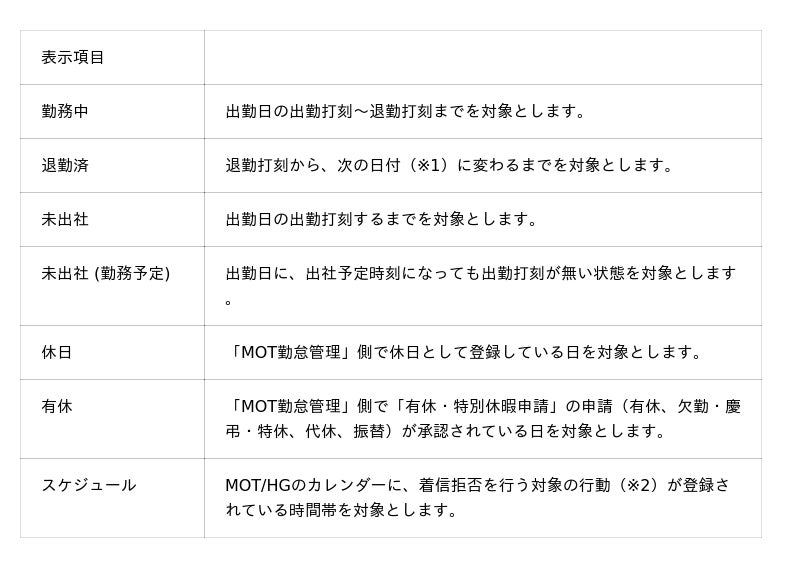 勤怠管理システム 「MOT勤怠管理」・人事総務向けシステム「MOT/HG」と連動し、出勤・退勤・有給休暇中やスケジュールに応じて自動で着信を制御する『自動着信拒否機能』です。