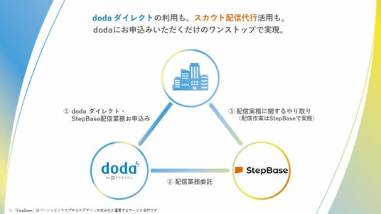 パーソルキャリア株式会社(本社:東京都港区、代表取締役社長 瀬野尾 裕)が運営する国内最大級のスカウトサービス「doda ダイレクト」は、パーソルビジネスプロセスデザイン株式会社(本社:東京都港区、代表取締役社長 市村 和幸)が提供する、バックオフィス業務を代行するオンラインBPOサービス「StepBase」と連携したサービスの提供を、2025年3月31日(月)より開始します。これにより、これまで「doda ダイレクト」利用時に企業側で対応する必要があった、求人票や配信文面の作成、配信などのスカウトサービスに関わる業務を、簡単な指示書の提供のみで、ワンストップで利用できるようになります。