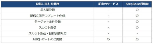 スカウトサービスは、企業が優秀な人材に直接アプローチができる点や、選考プロセスの短縮による採用活動の効率化など、企業の採用活動において多くのメリットがあります。一方で、配信前の求人票作成やターゲット選定、配信文面の作成などが、採用担当者の負担増加になるケースもあり、結果として企業側はスカウト配信枠を消化しきれない、個人側は自分の経験やスキルを評価してくれる企業と出会えるチャンスが減ってしまうなど、企業・個人双方にとっての機会損失につながっていました。そこで、スカウトサービス「doda ダイレクト」の新サービスでは、スカウトメール作成や配信業務を代行するオンラインBPOサービス「StepBase」と連携し、スカウト配信に必要な業務を代行することで、配信までの業務を一気通貫で支援することが可能になりました。