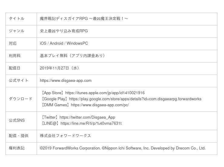 『魔界戦記ディスガイアRPG ~最凶魔王決定戦!』は、シリーズの世界観や、Lv9999まで育てて億を超えるダメージを叩き出す育成などのやり込み要素を継承しながらも、「魔界戦記ディスガイア」シリーズの歴代キャラクターたちが登場するオリジナルストーリーや、いつでもどこでもサクサク遊べるコマンドバトルを採用し、完全オリジナルゲームとしてお楽しみいただけます。