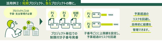 プロジェクトの予算や期間に応じて利用金額や期間を設定した子番号を発番することで、予算超過を防止します。管理者は経費利用状況をリアルタイムで確認でき、必要に応じて限度額や期間を調整することで、効率的な経費管理が可能です。