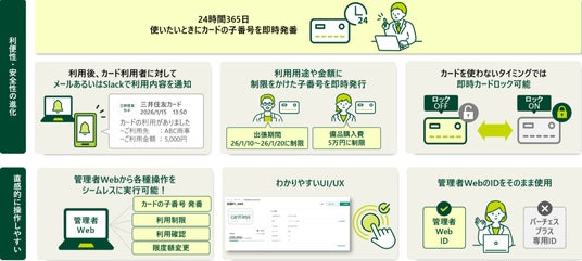 これにより、法人カードを利用した経費の"いつ、どこで、誰が、何に使ったか、安全に使われているか"といった情報を、収集・把握しやすくなるほか、セキュリティ面や利便性も強化します。