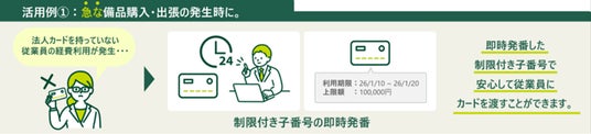 法人カードを持たない従業員でも、即時発番した子番号を利用し、備品購入、航空券やホテル予約、鉄道予約などが可能です。利用期間や金額、地域を制限することができ、加えて、使い切り子番号としても発番することができるので、安心してご利用いただけます。