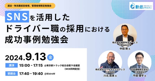 日本最大級のロジスティクス・物流コンサルティングファーム 船井総研ロジ株式会社(大阪本社:大阪市中央区、代表:橋本直行、以下「船井総研ロジ」)の経営コンサルタント講演情報です。2024年9月13日(金)に開催されるセミナー『SNSを活用したドライバー職の採用における成功事例勉強会』にて、船井総研ロジ 経営コンサルタント 松尾 一志が講演します。