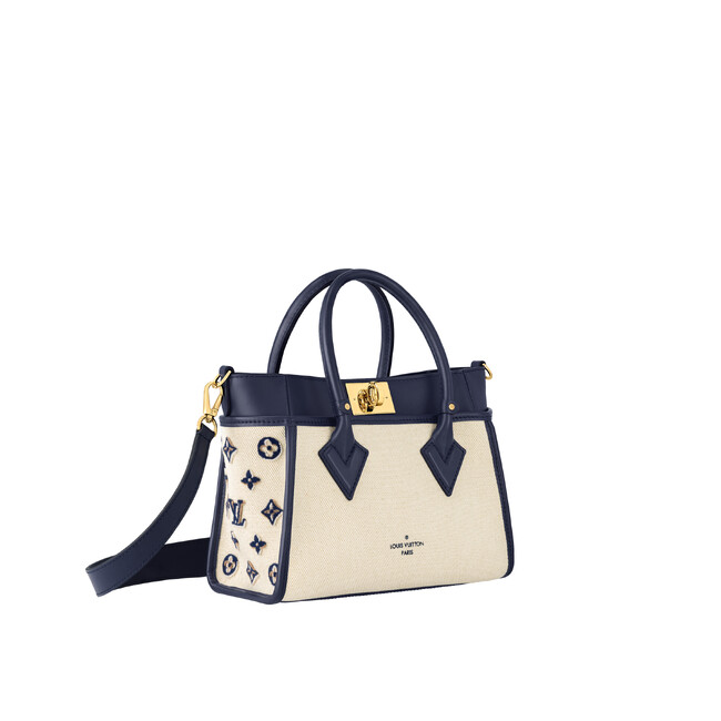 ネイビーブルーのレザーのトリミングと、同系色のトップハンドルが構築的な印象を演出する、コーティング加工を施したキャンバス生地を使用した「オンマイサイド PM」。マチにはタフタージュの刺繍で表現したモノグラム・パターンをあしらって、ラグジュアリーな雰囲気に仕上げられています