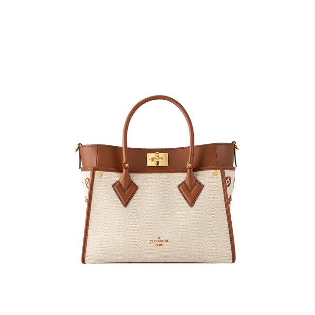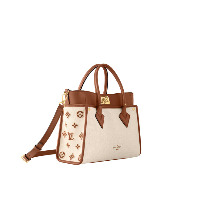 クリーム色のキャンバス生地を使用し、トリミングとトップハンドルにはなめらかなレザーをあしらった「オンマイサイド MM」。キャンバス生地のサイドのマチには、レザーのトリミングと同色のタフタージュの刺繍で表現したモノグラム・パターンが彩りを添えます。内側にはストライプで彩ったキャンバスでライニングを施し、海辺のビーチのような雰囲気が際立ったデザインになっています。