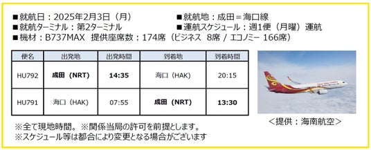 現在、東京=海口間を結ぶ直行便は無く、また成田空港にとっても初となる海南島への直行便となることから、インバウンド・アウトバウンド双方向で新たな需要が生まれることが期待されます。
