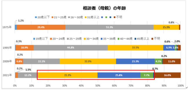 開設当初は8割以上が30歳以下だったのに対し、2002年は30歳以上の相談が半数を超え、2021年には30歳以上が約80%を占める。
