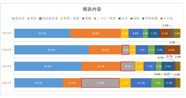 開設当初から、授乳や離乳食のことなど「食生活」は相談内容の中で最も多い項目として変わりはない。2021年においては、「相談者自身」に関する相談が赤ちゃんの「身体」に関する内容を抜き、相談内容の2位となった。人間関係の相談や育児のストレスに加え、近年コロナ禍において日常の何気ないことを周りと共有できにくく育児への孤立感が強まったこともその一因と見受けられる。