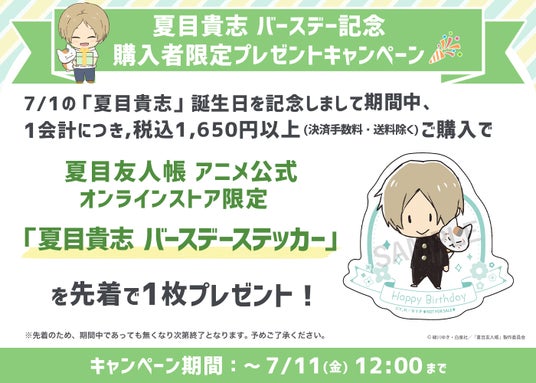 7月1日の夏目貴志の誕生日を記念して期間中、「夏目友人帳 アニメ公式オンラインストア https://natsume-animestore.jp 」 にて1会計につき、税込1,650円以上(決済手数料・送料除く)ご購入で、「夏目友人帳 アニメ公式オンラインストア」限定「夏目貴志 バースデーステッカー」を先着で1枚プレゼントいたします!