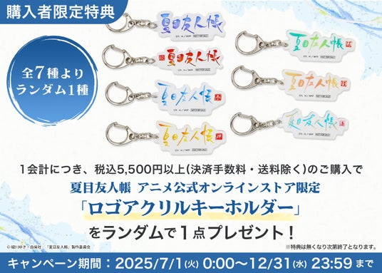 「夏目友人帳 アニメ公式オンラインストア https://natsume-animestore.jp 」 にて 1会計につき、税込5,500円以上(決済手数料・送料除く)ご購入で、夏目友人帳 アニメ公式オンラインストア限定「ロゴアクリルキーホルダー(全7種よりランダム1種)」を1点プレゼントいたします!是非この機会にご利用ください。
