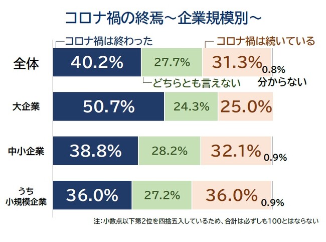 また、企業規模別に「コロナ禍は終わった」とする企業をみると、「大企業」は50.7%と5割に達した。「中小企業」は38.8%、そのうち「小規模企業」は36.0%となり、「大企業」とは10ポイント以上の差が表れた。